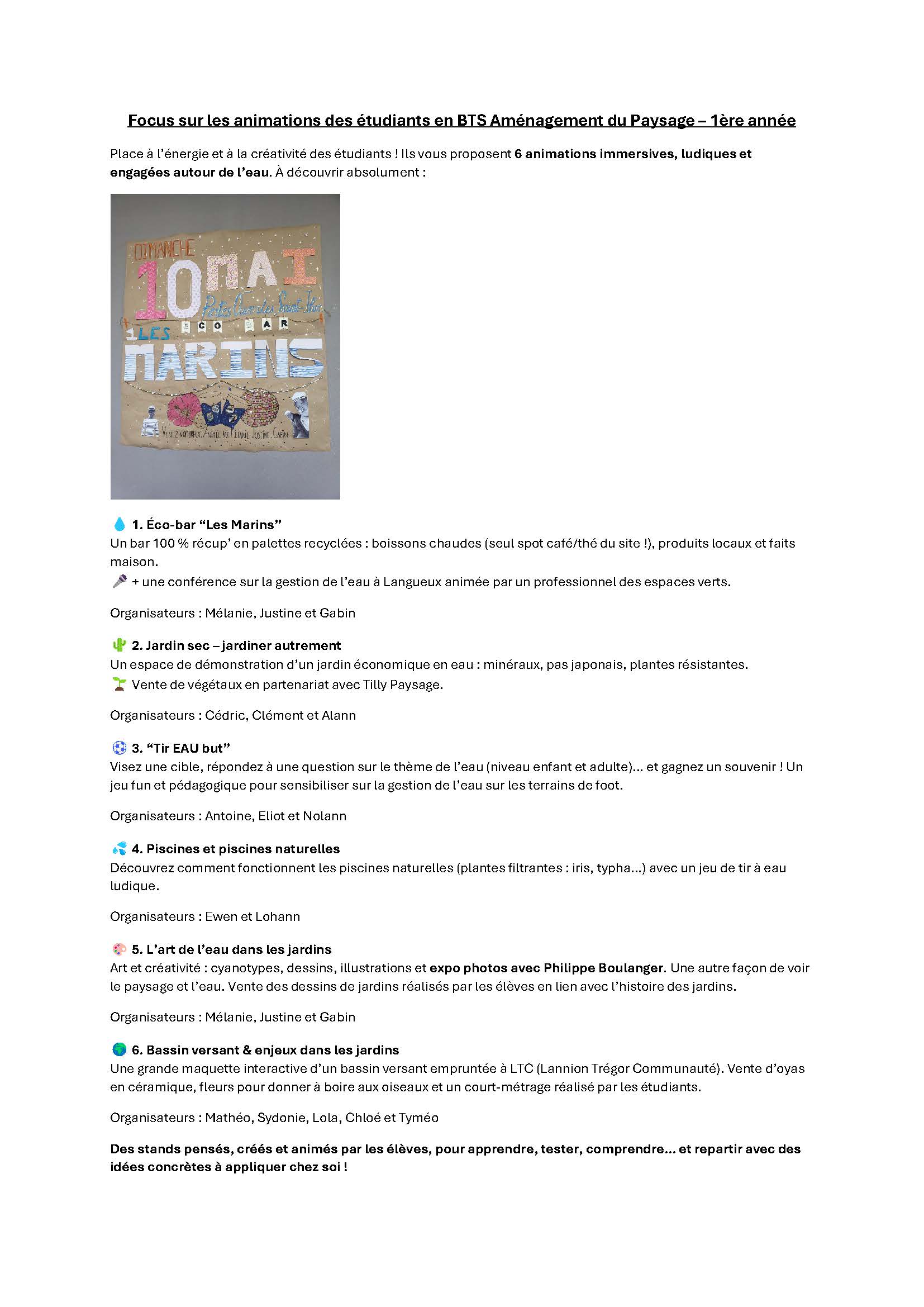 - Ateliers animés par les élèves de BTS 1ère année en aménagement paysager (jeux, expériences, démonstrations, expositions...)
