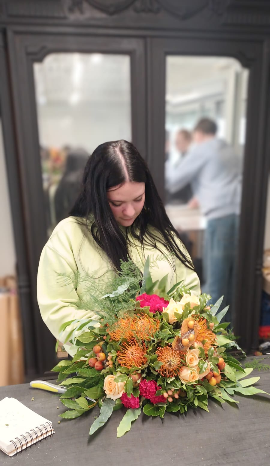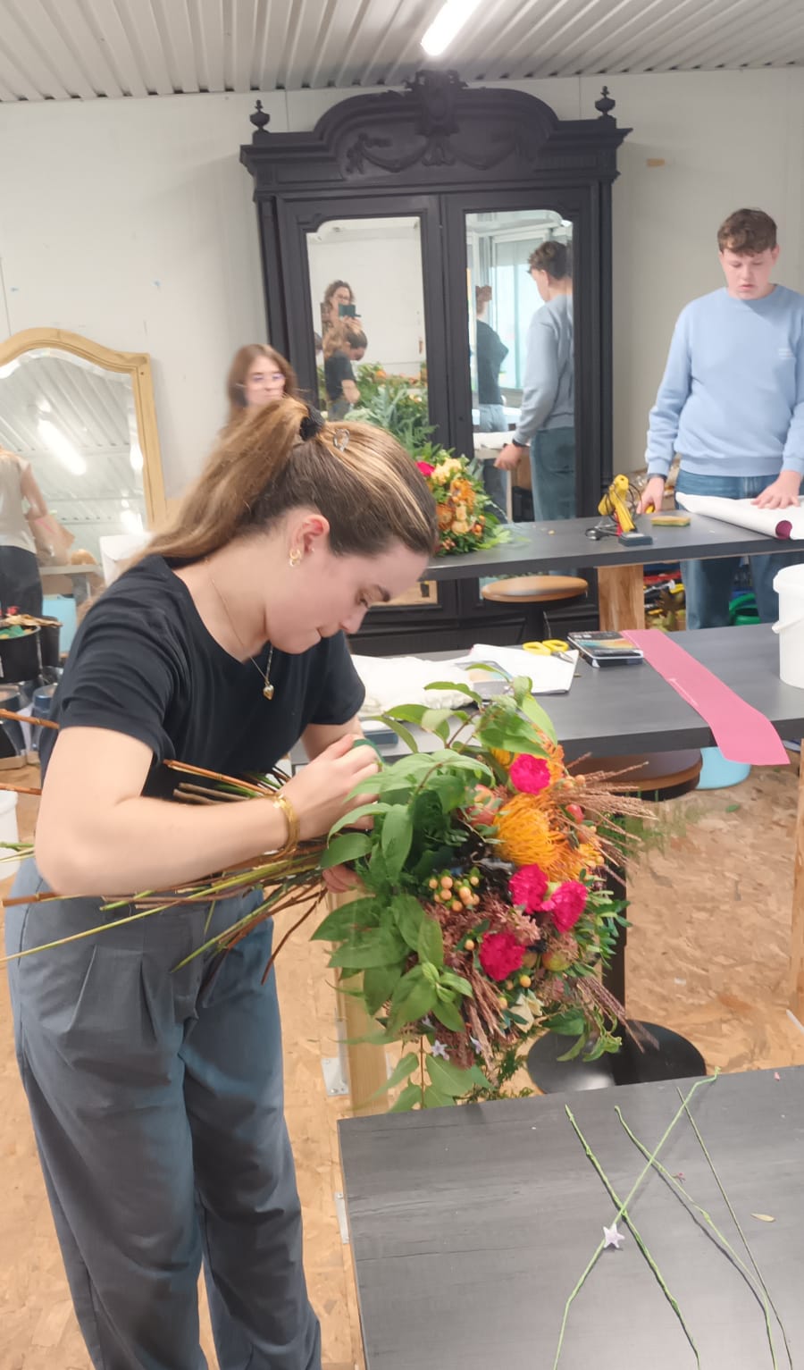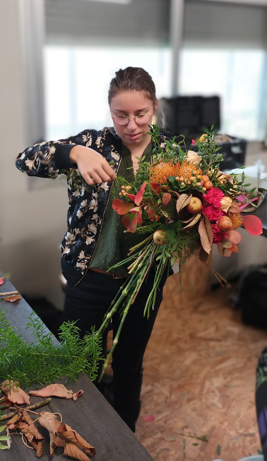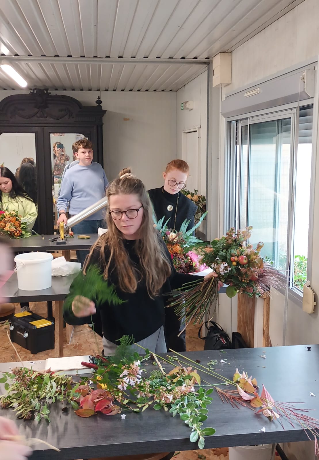 Réalisation de bouquets liés ronds de style décoratif, asymétrique par masse avec les apprentis en CAP Fleuriste 2ᵉ année et en un an.Un bel exercice de créativité et de technique florale. Bravo pour le résultat